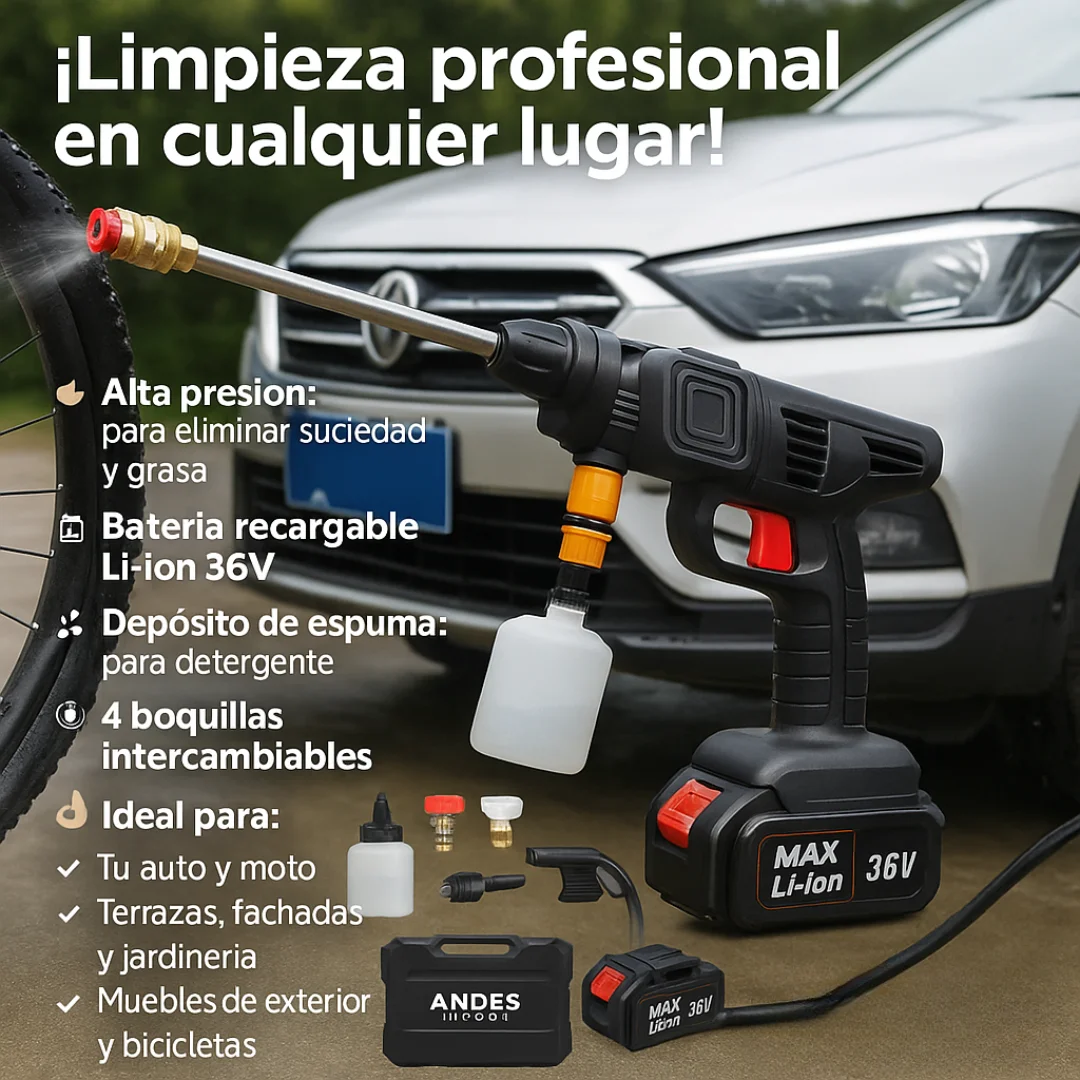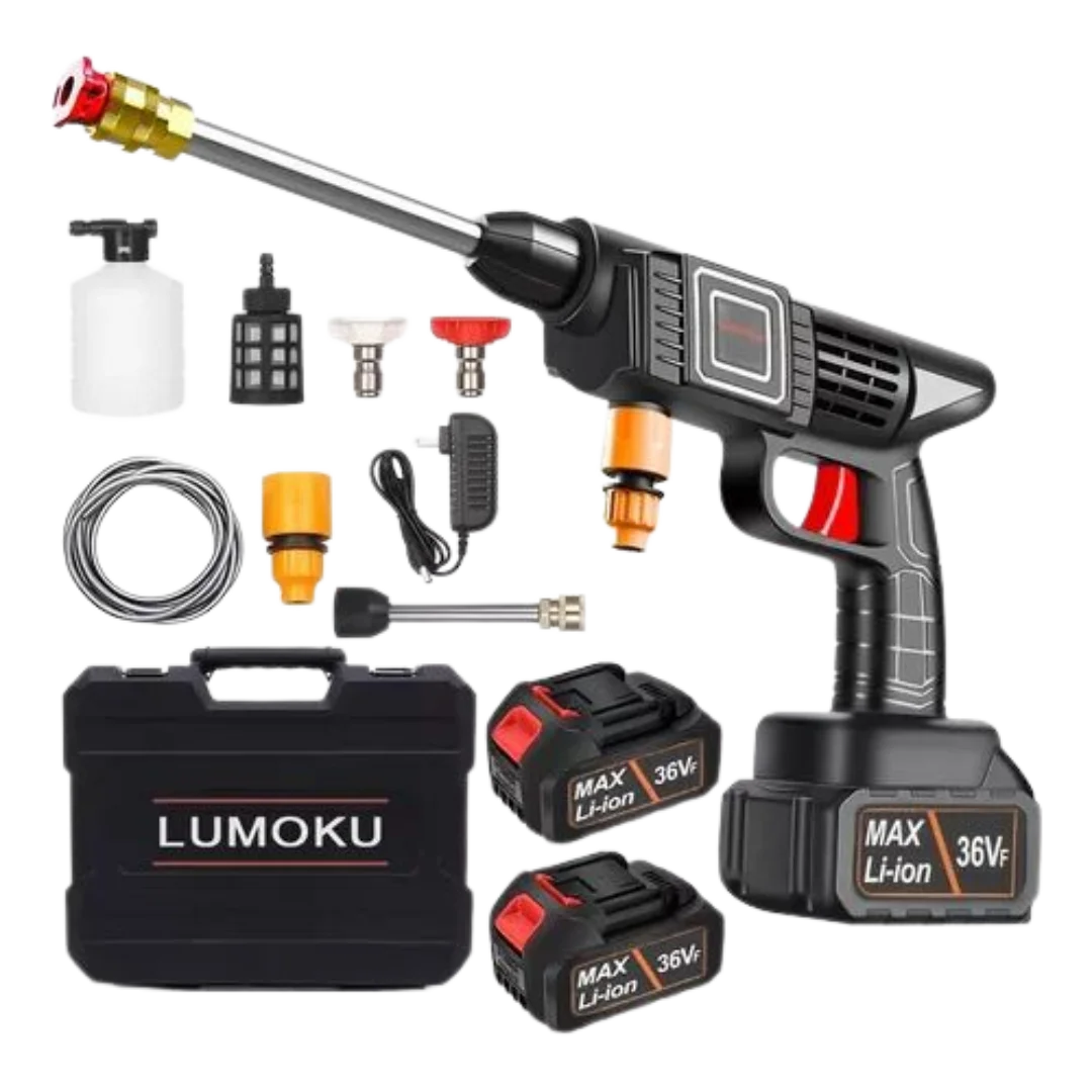¡Potencia y libertad para limpiar donde quieras! La hidrolavadora portátil inalámbrica LUMOKU de 36V te ofrece la comodidad de una limpieza a presión sin cables ni restricciones. Equipada con dos baterías recargables de litio, es perfecta para lavar autos, motos, bicicletas, terrazas, muebles de jardín y cualquier superficie exterior.