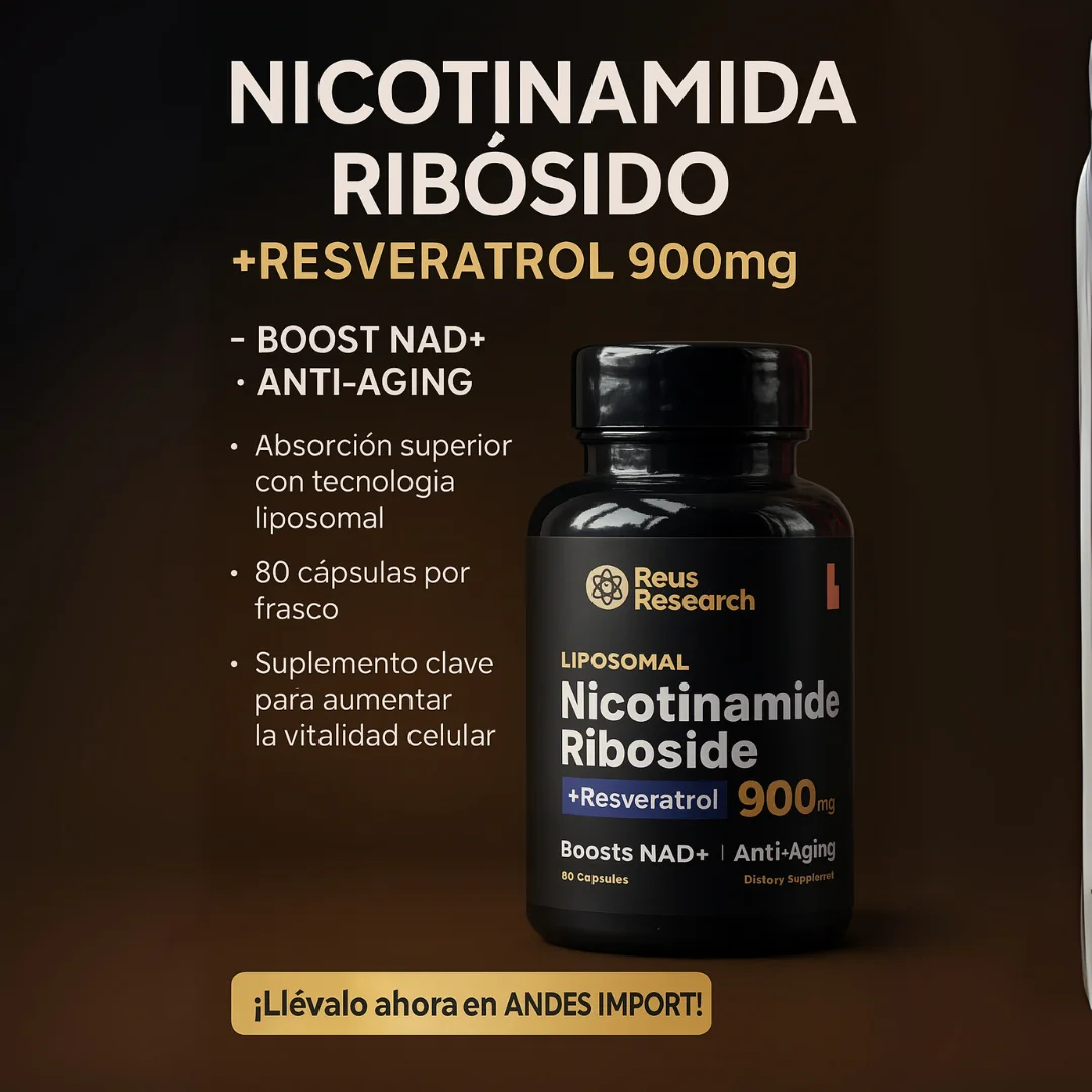 Activa tu energía celular y combate el envejecimiento desde el interior. El suplemento Liposomal Nicotinamide Riboside + Resveratrol 900 mg de Reus Research está formulado con tecnología liposomal para una absorción superior y resultados óptimos.